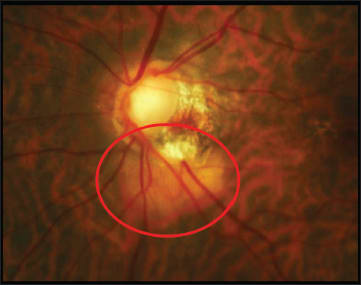 Figure 7. This 72-year-old woman had a red-orange lesion on the inferior pole of the optic nerve.
