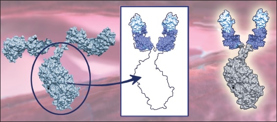 Figure 2. The Fc portion of IgG1 (left) is fused to the two dual-domain arms (center) resulting in the engineered molecule of aflibercept (right). This exemplifies how a molecule can be designed to possess specific properties of different naturally-occurring molecules with a goal of optimizing therapeutic activity.