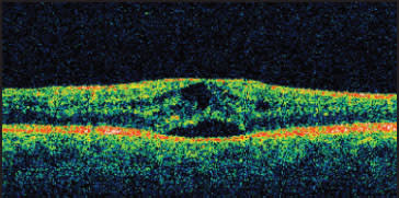 ■ June 5, 2003: Macular edema increased to 420 µm, and vision decreased from the last visit to 20/60. An intravitreal injection of triamcinolone was given. At a subsequent visit, visual acuity returned to 20/40. In an attempt to maintain visual acuity at that level, topical steroid and topical non-steroidal anti-inflammatory drops were prescribed. At this point, the clinical course of the patient's condition was similar to what is seen in Irvine-Gass syndrome, i.e., CME following cataract surgery, which is typically treated with these topical agents. Many of the available topical steroid and NSAID drops are specifically indicated for the reduction of ocular inflammation following cataract surgery, and it is generally accepted that their effectiveness against CME can be synergistic. With use of the drops, the patient's visual acuity was maintained at 20/40 for more than a year.