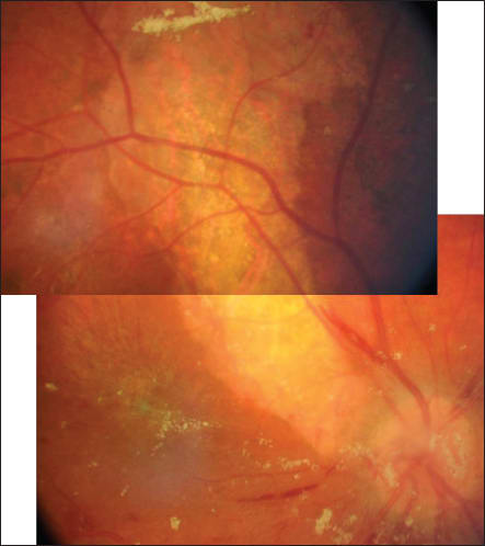 After removal of opacities, we found a retinal break on the attached retina (the site of the larva's penetration), and hypopigmented stripes indicating movement of the larva in the subchorioidal space.
