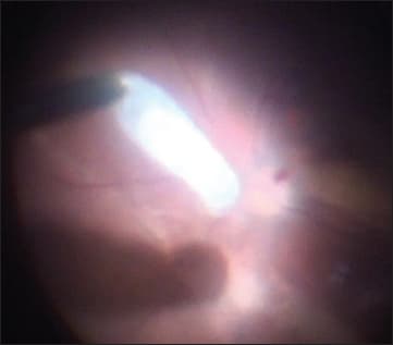 Figure 3. The larva was removed from the vitreous cavity with vitreal forceps.