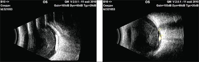 On ultrasound scan, in the lower inner quadrant at eight o'clock in the equatorial zone, a foreign structure was detected (size 1.4 x 1.5 mm; length 8.2 mm), changing position with eye movement. The retina was attached (Figure 1).