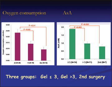 Figure 3. In these graphs, the state of the vitreous gel is graded: <3 represents gel-like vitreous; >3 represents liquefied vitreous gel; and “2nd surgery” represents liquid vitreous after vitrectomy. The rate of oxygen consumption is slower as the vitreous gel liquefies and contains less ascorbate.