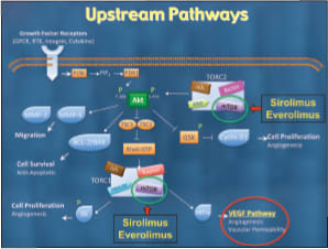 Returning to the VEGF cascade, Dr. Slakter pointed out that upstream of the extracellular space, there is a complicated series of events result in VEGF production (Figure 14). Compounds that could be effective against VEGF in this part of the cascade include sirolimus and Palomid 529, the latter of which not only blocks abnormal neovascularization but, unlike currently available anti-VEGF agents, will allow for normal angiogenesis. Palomid 529 is currently being investigated in a phase 1 trial.