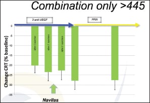 With most of the enrolled patients followed for four to six months, the average number of injections was 1.7 ±1.5 with an average improvement of 6.4 letters (Figures 21 and 22). Based on the central foveal thickness at baseline, 27 eyes received combination therapy (CRT at baseline ≥300 µm on Stratus OCT), and 19 eyes received focal/grid laser alone (CRT <300 pm at baseline). The combination group received three monthly injections of Avastin followed by Navilas laser treatment when CRT decreased to less than 300 µm. After, retreatment was based on worsening criteria, defined as a >20% increase in CRT and >6 letters dropped in BCVA, compared to the stabilized visual gain obtained after three anti-VEGF injections.