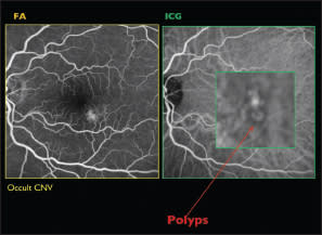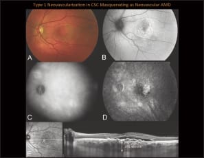 Dr. Freund continued, “If you look at eyes that develop PCV, it's probably not a coincidence that they are the same eyes that develop type 1 neovascularization.” Thus, polyps are seen not only with neovascular AMD, but also with peripheral exudative hemorrhagic chorioretinopathy, peripapillary CNV, within type 1 neovascular tissue arising overly choroidal nevi, and in cases of chronic central serous chorioretinopathy (CSC) which develop vascularized pigment epithelial detachments.
