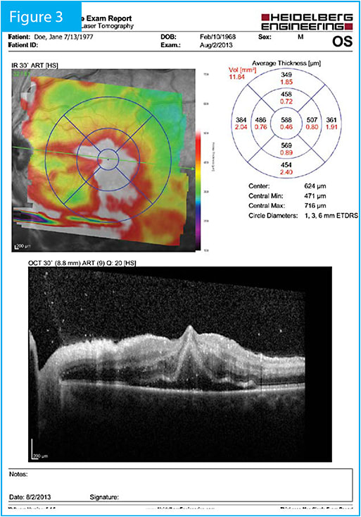 The patient is a 45-year-old otherwise healthy male who presented with sudden loss of vision in his left eye. Visual acuity OS was counting fingers inferiorly at 6 feet. Clinical exam and color fundus photography (Figure 1) revealed a hemiretinal vein occlusion, which fluorescein angiography confirmed (Figure 2). Central retinal thickness was 624 µm as measured by Spectralis SD-OCT (Heidelberg Engineering) (Figure 3).