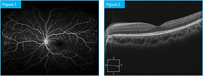 Figures 1 and 2. In this eye imaged with ultra-widefield angiography and OCT, peripheral ischemia is present without associated macular edema. The ischemia should be closely monitored, however, given its propensity to cause either neovascularization or persistent/recurrent macular edema.