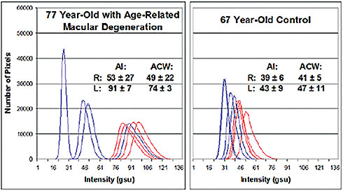 Figure 2. Retinal flavoprotein autofluorescence pixel intensity histograms from a 77-year-old patient with AMD (left) and from a 67-year-old control patient without visible clinical findings of AMD (right). The AMD patient had a history of resolved exudative AMD with BCVA of 20/50 OD and dry AMD with GA and BCVA of 20/400 OS. The figure presents four histograms of the right (blue) and left (red) eye from each patient. Right shift of histograms denotes increased retinal flavoprotein autofluorescence intensity. Broader curve width denotes greater cellular variability in flavoprotein autofluorescence intensity within the imaged 3° field. (AI, average pixel intensity; ACW, average curve width; gsu, grayscale units.)