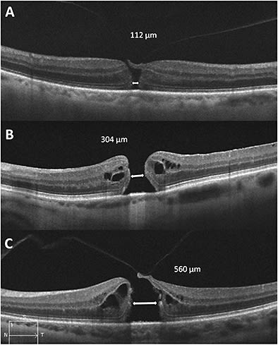 Figure 2. OCT scans illustrating examples of FTMH according to the IVTS classification system. A) Small FTMH with aperture size ≤250 µm. Note the overlying vitreous attachment. B) Medium FTMH with aperture size >250 µm and ≤400 µm. There is no associated vitreous attachment. C) Large FTMH with aperture size >400 µm. Persistent vitreous attachment is visible at the edge of the hole.