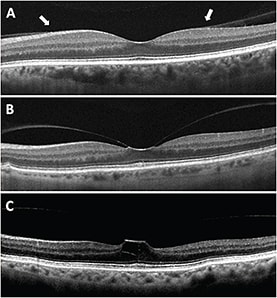 Figure 1. OCT scans demonstrating VMA and VMT, according to the IVTS classification system. A) Broad VMA with attachment >1,500 µm and no detectable change in foveal contour. B) Focal VMT with attachment ≤1,500 µm and distortion of the foveal surface. C) Focal VMT with foveal cystic changes.