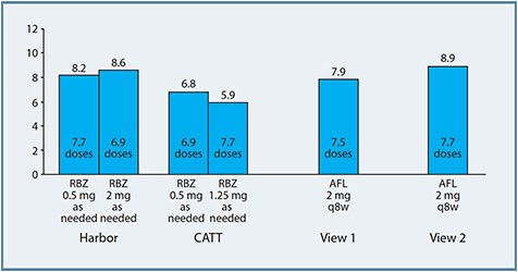 The VEGF Trap-Eye Investigation of Efficacy and Safety in Wet AMD (VIEW 1) and VIEW 2 studies compared the outcomes of patients who received ranibizumab with the outcomes of patients who received aflibercept.5 The VIEW studies were registration trials for aflibercept and had 4 arms: aflibercept, 0.5. mg or 2.0 mg, monthly, aflibercept, 2.0 mg, every other month (after 3 monthly loading doses), or ranibizumab monthly. The first year followed this fixed-dose regimen; in the second year all study arms required capped as-needed dosing, with 1 injection given every 3 months and additional retreatment given during the intervening months based on OCT and vision criteria. In year 1 of VIEW, the 4 groups had nearly identical visual acuity gains ranging from 8.3 to 9.3 letters in the pooled VIEW 1 and VIEW 2 data set.