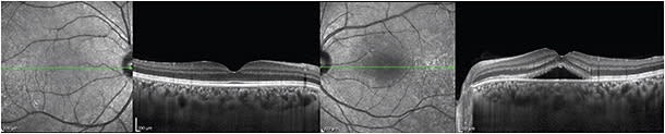 The choroid is thicker in CSR (Figure 1) than in normal eyes (414-478 µm vs 248 µm, respectively), and the choroidal vascular lumens appear enlarged.11 In chronic CSR, a “double layer sign” may appear, with an undulating RPE layer, hyporeflective middle layer, and intact Bruch’s membrane.11