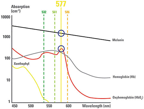 The advantages of the 577-nm–wavelength laser are near-zero absorption by xanthophyll (macular pigment), excellent combined absorption by melanin and oxyhemoglobin, better penetration through cataracts, a moderate power level, and improved patient comfort (Figure 1, page 30).