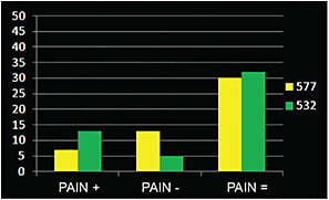 Figure 5. Percentages of patients experiencing more, less, or similar pain after the 577-nm and 532-nm laser sessions.