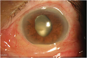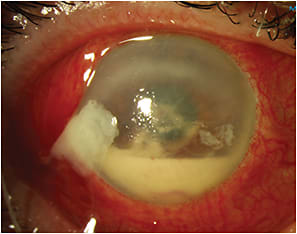 Figure 1. Anterior-segment photograph, left eye, of a patient who developed endophthalmitis following an intravitreal ranibizumab injection. The cultures isolated coagulase-negative Staphylococci.