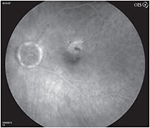A 79-year old woman complained of decreased visual acuity – from 20/25 to 20/50 – of 5 weeks’ duration. A color fundus photograph of the left eye (Figure 1) showed macular edema and scattered intraretinal hemorrhages. Significant intraretinal dye leakage due to retinal angiomatous proliferation (RAP) was seen on the fluorescein angiogram (Figure 2). The OCT image (Figure 3) demonstrated intraretinal edema with insignificant vitreomacular adhesion. At follow-up, the patient received aflibercept 2 mg intravitreally and returned in 4 weeks for re-evaluation. Her visual acuity had improved to 20/30 and the repeat OCT image (Figure 4) showed complete resolution of the intraretinal edema.