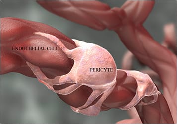 Investigators have studied the role of pericytes in relation to endothelial cells in CNV due to AMD. Platelet-derived growth factor (PDGF) binds to a receptor on pericytes. To stabilize endothelial cell channels, the angiogenic endothelial cells release PDGF-B to chemoattract PDGF receptor-B containing pericytes.
