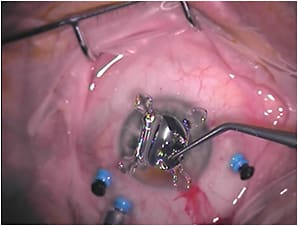 We perform implantation through a 2.8-mm corneal incision. In some cases, we implant the add-on IOL immediately after the phacoemulsification or, in pseudophakic eyes, prior to vitrectomy. However, in some cases, we implant the IOL later in the intervention if we decided on silicone oil injection later.