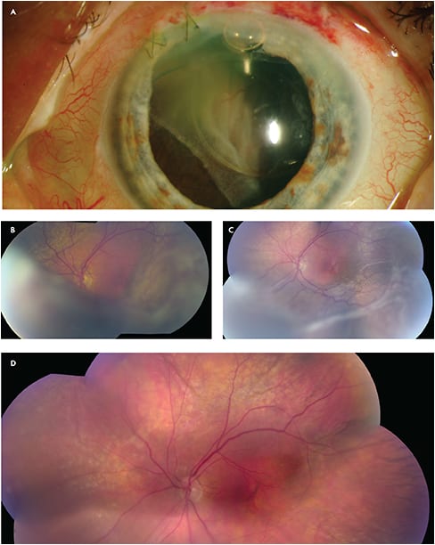 Figure 1. External photograph (A) of the patient’s left eye, demonstrating kissing SCH posterior to the IOL. Photo montage (B) of the fundus at three-week follow-up, showing dramatic reduction in the size of the SCH. Photo montage (C) of the fundus at five-week follow-up, showing retinal folds and persistent SCH in the inferior parts. Completely resolved SCH (D) with retinal folds.