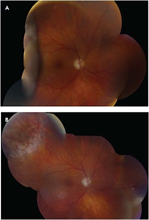 Figure 2. Indirect ophthalmoscopy (A) of large SCH and five-month follow-up (B) showing completely resolved SCH.