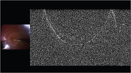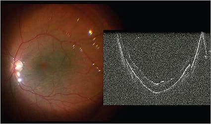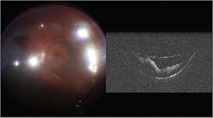 A clinical case utilizing the Haag-Streit iOCT unit perhaps best illustrates the versatility and utility of intraoperative OCT. In this patient (Figure 2), a full-thickness macular hole has caused a rhegmatogenous retinal detachment. Visual acuity has been 20/400 for the past month. Both the macula-involving detachment and the macular hole are evident clinically and are unequivocally confirmed by iOCT through the direct contact lens.