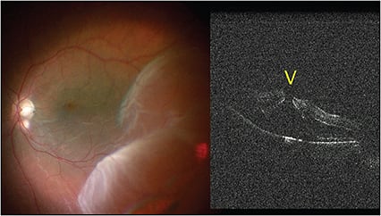 Following air-fluid exchange, a small amount of subretinal fluid has accumulated under the macula that was not evident clinically. Note the back of the air bubble and a small amount of preretinal fluid, which was also not evident clinically (Figure 5, page 50).