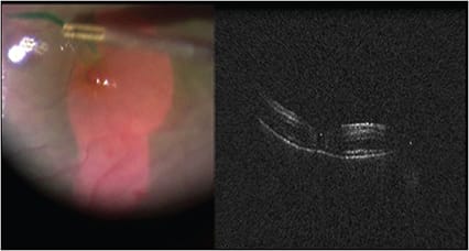 Anterior segment iOCT may also be useful for the retinal surgeon. Here, iOCT of the pars plana immediately after trocar cannulas are removed clearly illustrates the rationale for beveled vitrectomy trocar cannula placement. In this image of the pars plana after the cannulas are removed, an open 25-gauge sclerotomy is present with a small conjunctival bleb (Figure 7). This is in sharp contradistinction to this much more beveled sclerotomy which is closed and does not have an overlying conjunctival bleb (Figure 8, page 52).