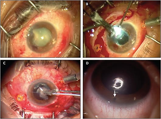 If the crystalline lens is intact, it does not have to be removed (Figure 2D). In fact, even in cases in which there are peripheral cataractous changes due to an IOFB, the lens can be preserved. It has been shown that the cataract does not necessarily progress rapidly, and lenticular opacity remains localized to an eccentric location.17 The lens can be removed either by phacoemulsification or via pars plana lensectomy.