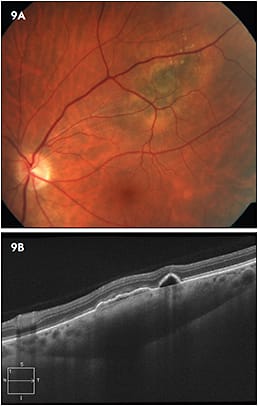 Choriocapillaris thinning overlying the nevus, RPE atrophy, RPE loss, RPE nodularity, photoreceptor loss, inner segment-outer segment (IS-OS) junction irregularity, IS-OS loss, external limiting membrane irregularity, outer nuclear and outer plexiform layer irregularity, inner nuclear layer irregularity, and subretinal fluid have all been described in the imaging of choroidal nevi.8 EDI-OCT may also allow for more precise measurements of nevus thickness and judgment of related effects on the surrounding structures (Figure 9).