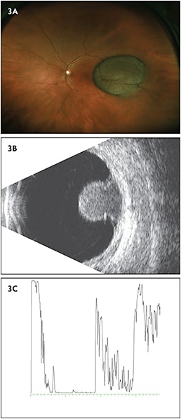 Figure 3. A) A mushroom shaped pigmented choroidal melanoma. The intrinsic vasculature is observed within the tumor. Gravity-dependent subretinal fluid can also be observed. B) B-scan ultrasonography reveals a highly reflective anterior border with strong sound attenuation (acoustic hollowness); choroidal excavation and the absence of extraocular extension should be noted. C) A-scan ultrasonography demonstrates low to medium internal reflectivity and a regular internal structure.
