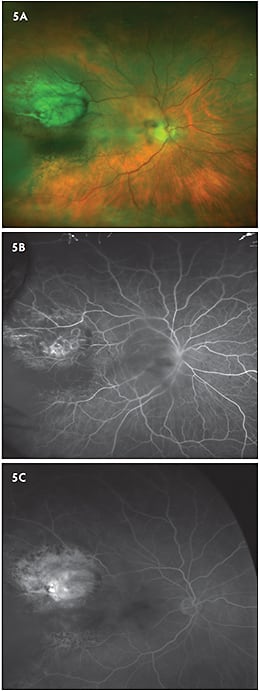 Fundus photography and more recently ultrawidefield (UWF) imaging allow the clinician to document the size, shape, and features of lesions. UWF allows for the imaging of larger and more peripheral lesions that otherwise could not be imaged (Figure 1). This modality does not replace indirect ophthalmoscopy, because color and image size distortion remain issues. The latter prevents accurate measurement of the peripheral tumors.