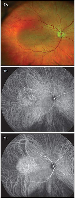 ICG is most useful in the diagnosis of a circumscribed choroidal hemangioma. Marked progressive hyperfluorescence, wherein small caliber vessels are observed initially and later completely obscure the choroidal pattern, followed by clearing of the dye with a “washout” phenomenon, is usually seen. Maximal fluorescence is usually observed within one to five minutes of dye injection (Figure 7).