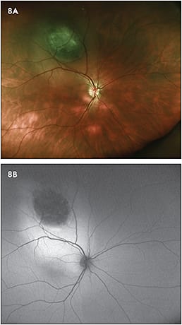 Fundus autofluorescence (FAF) photography relies on the stimulated emission of light from naturally occurring fluorophores mainly from the RPE and Bruch’s membrane and fluorescent molecules, such as lipofuscin. Because lipofuscin (orange pigment) is a risk factor for tumor growth, FAF photography may be helpful in evaluating small melanocytic tumors, in which lipofuscin is not observed clinically. Evidence of prior subretinal fluid or leakage from a small melanocytic lesion may be observed as well (Figure 8).