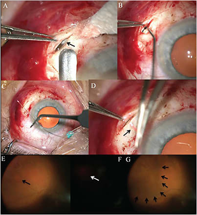Figure 1. Suprachoroidal buckling: A. Sclerotomy at 4 mm from limbus. Note the left side of the wound showing proper choroid exposure, while the right side shows remaining scleral fibers (arrow). B. Healon use to create the plane between the sclera and the choroid. C. Microcatheter being held by non-toothed curved forceps. D. Microcatheter being inserted perpendicular to the sclerotomy plane. Note the red light at the tip (arrow). E. Flashing red light at the tip of the microcatheter placed just posterior to the tear (arrow). F. Red light seen with microscope light off. G. Choroidal indentation and retinal reattachment after Healon GV injection (arrows).