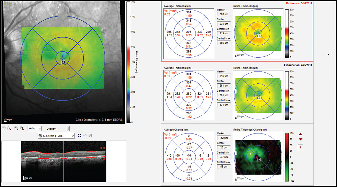 Progression analysis of OCT images is probably the single best tool for following AMD patients. In progression analysis, we generate a color-coded map that corresponds to the changes compared to a reference map (Figure 1).