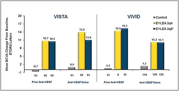 Figure 5 shows the treatment effects in the subgroups of patients treated with an anti-VEGF agent prior to enrollment compared to treatment-naïve subjects. Subjects assigned to either dosing regimen of aflibercept demonstrated similar benefits to therapy, regardless of prior treatment