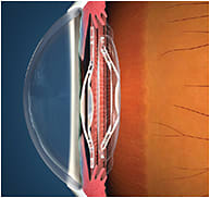 A rendering of the iolAMD dual-lens telescopic vision system implanted in the sulcus and capsular bag.