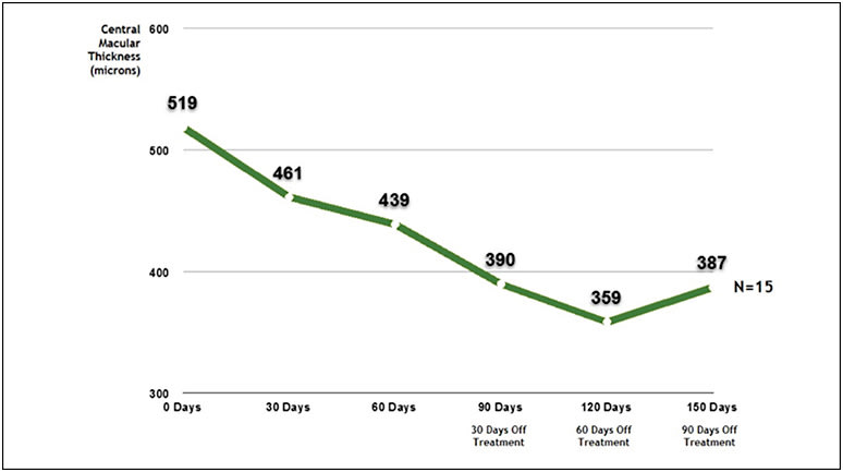 Figure 3. With ALG-1001, mean macular thickness on OCT decreased by 30% over 90 days.