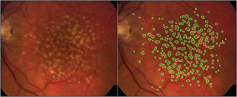 Figure 2. Segmentation of drusen from a patient with macular degeneration. (Left) Unprocessed original image. (Right) Drusen detected using a statistical model.
