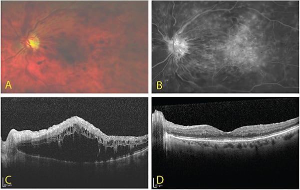Figure 2. A) Color fundus photograph of left eye showing scattered microaneurysms, peripapillary flame-shaped hemorrhage, and focal laser scars. B) Fluorescein angiogram of left eye showing diffuse macular leakage. C) OCT of left eye showing persistent IRF after 1 year of monthly intravitreal ranibizumab injections. D) Resolution of IRF shown 3 months after intravitreal dexamethasone implant.