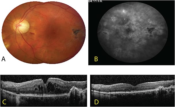A 60-year-old woman with a history of diabetes for 20 years presented with complaints of decreased vision in her left eye for many years. She had a history of PDR that required panretinal photocoagulation (Figure 2A, page 58). In addition, she had a history of DME previously treated with focal laser and monthly injections of ranibizumab over one year, with improvement in her vision from 20/100 to 20/60.