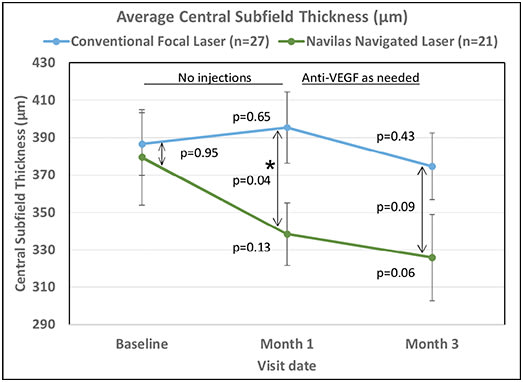 Figure 1. A comparison of average central subfield thickness (µm) between patients receiving Navilas laser therapy and conventional focal laser treatment, showing greater reduction in the Navilas group