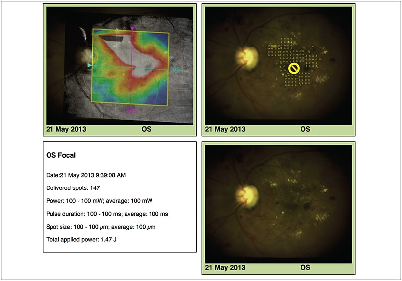 At our clinic, the patient received OCT-based navigated laser treatment in the left eye (Figure 3). Six months after the treatment, the presence of macular edema was reduced significantly, and the patient’s VA demonstrated stability at 20/40 (Figures 4 and 5, page 44).