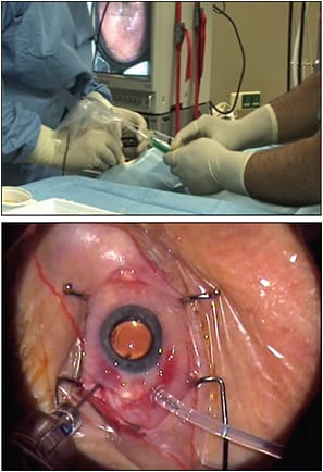 Figure 5. Top) Intrector setup with manually controlled infusion and aspiration; indirect ophthalmoscope image delivered to control monitor. Bottom) Retrector setup with hydrostatic infusion and manually controlled aspiration.