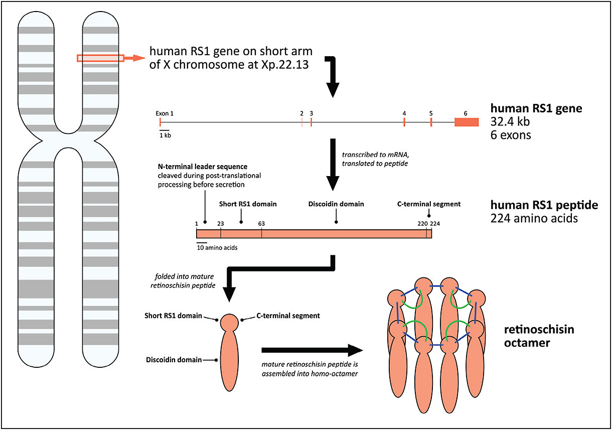 The RS1 gene is 32.4 kb in length and located on the short arm of the X chromosome (Figure 3, page 67). The RS1 gene encodes the retinoschisin peptide, which is 24 kDa, contains 224 amino acids, and is assembled into a homo-octamer before secretion into the extracellular space.1,23,24
