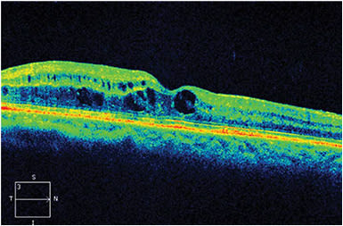 Six weeks after combination therapy, the CFT had decreased to 352 µm and visual acuity had improved to 20/60-2 (Figure 2). The swelling remained stable for 3 months (Figure 3), after which the CFT increased to 546 µm.