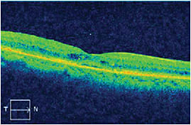 Three months later, (4 months after the Lucentis injection), the swelling recurred (Figure 6), and the patient was treated again with Lucentis followed by Ozurdex 2 weeks later. Her OCT CFT decreased to 226 µm and visual acuity improved to 20/30-2 (Figure 7). The patient’s visual acuity and CFT have remained stable for 2 months. We will continue with this regimen if the swelling recurs or the vision degrades.