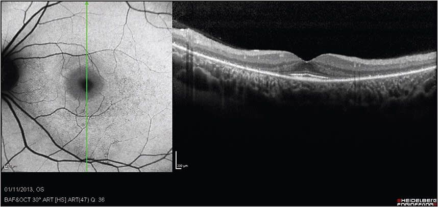 Figure 2. SD-OCT imaging demonstrates perifoveal thinning of the ellipsoid layer and outer retina, with a preserved central fovea (the “flying saucer” configuration). FAF imaging demonstrates perifoveal hyperautofluorescence, surrounded by granular hyper-/hypoautofluorescence.
