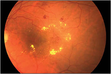 A 69-year-old woman with a 20-year history of mildly controlled type 2 diabetes (hemoglobin A1c of 8.1) and hypertension presented for a second opinion regarding the vision in her left eye. Her ocular history was significant for cataract surgery and center-involving DME in the left eye. Despite ongoing monthly injections of bevacizumab (Avastin, Genentech) and ranibizumab (Lucentis, Genentech), and multiple focal macular laser treatments, her visual acuity had stabilized at 20/70 with a significant amount of edema and increased macular lipid (Figure 1A). Four injections of Lucentis had reduced the DME by approximately 20%, after minimal improvement was achieved with six injections of Avastin (Figure 1B).